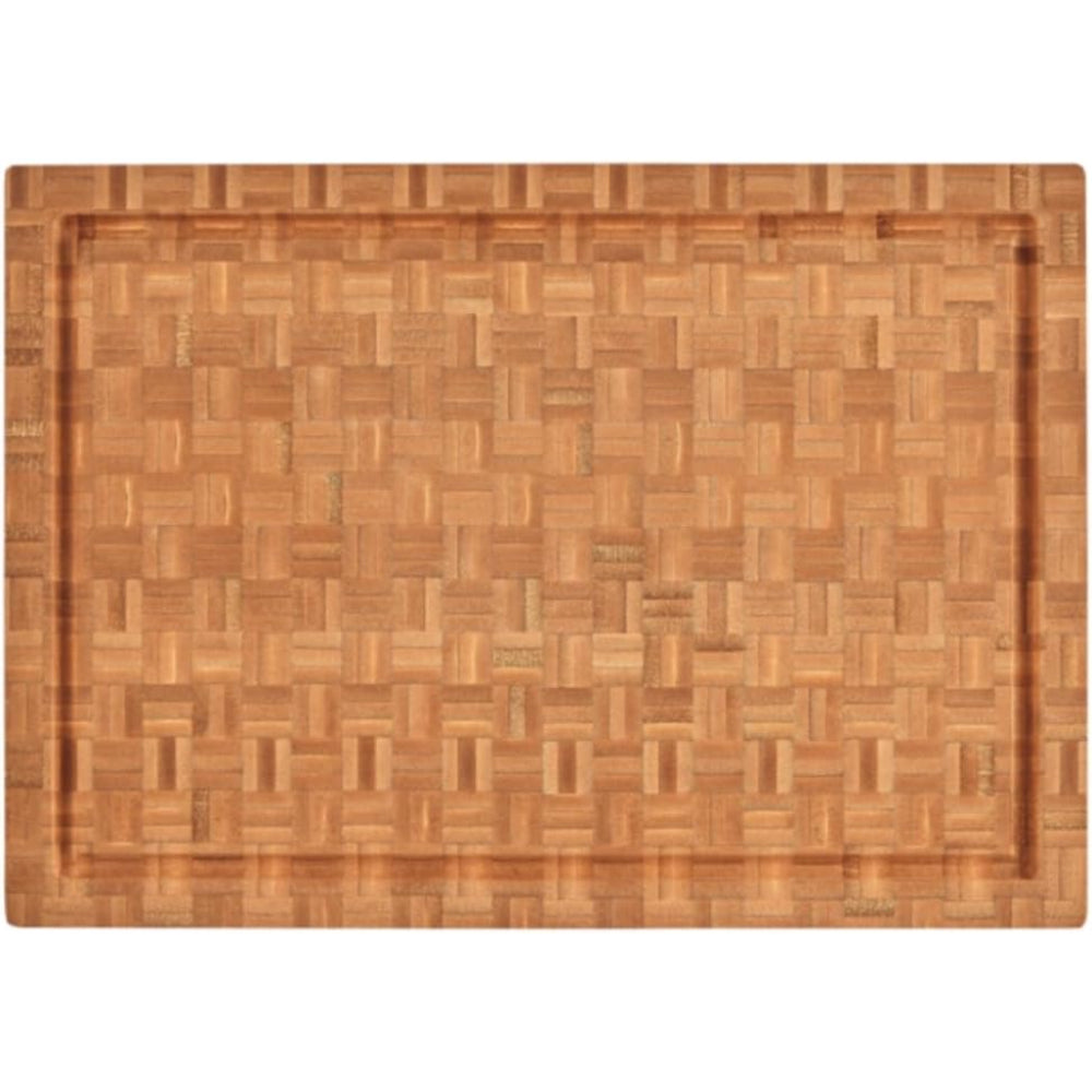 Combina estilo y funcionalidad con esta tabla de cortar fabricada en bambú de grano final, resistente y visualmente atractiva. Su diseño reversible incluye una superficie lisa para cortar todo tipo de alimentos y un lado con ranura profunda para retener jugos. Ideal para frutas, verduras y carnes. Incluye asas integradas que facilitan su manipulación, almacenamiento y servicio.